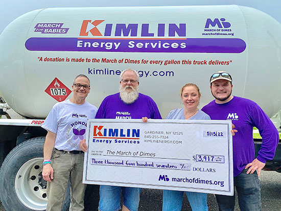 A donation of $3,417.16 was made by Kimlin Energy Services to the Hudson Valley March of Dimes at the annual March for Babies fundraiser on May 15th at the FDR State Park in Yorktown Heights. The event is part of Kimlin’s ongoing support of the local March of Dimes by making a donation for every gallon delivered by Kimlin’s specially-branded “March for Babies” propane truck. This marks Kimlin’s 10th year in ongoing support of the HV March of Dimes, spearheaded by longtime employee Perry Kimiln. Perry was joined in donating the check by volunteer Gregg Isaacson, Annette Trotta Flynn of the March of Dimes, and Ben Newman, also from Kimlin. Thank you for your incredible efforts to help babies and their families.